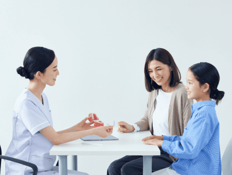 次に、矯正専任のカウンセラーより、なぜ歯並びが悪くなってしまうのか?お子さまの歯並びを改善するためにどんな治療・トレーニングが必要なのか、治療効果など詳しい治療内容のお話をさせていただきます。